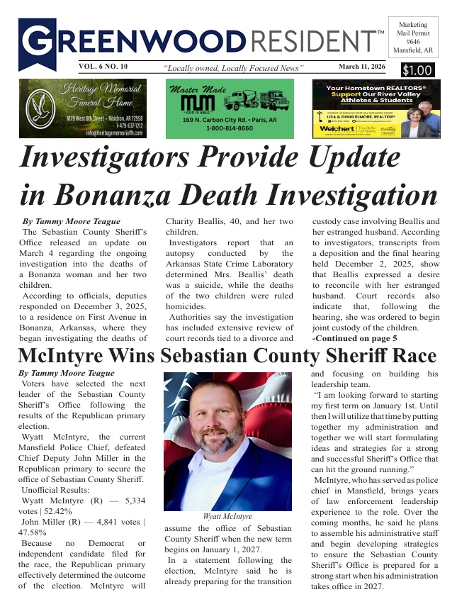 Greenwood Resident 03/11/26 Vol. 6 No. 10 Insider 8:17 pm Updated: 2 hours ago By Resident News Network Share FacebookTwitterLinkedinPinterestWhatsAppEmail This content is reserved for RESIDENT INSIDER members. Please login or subscribe to view. - Paid Advertisement - Resident News Networkhttps://residentnewsnetwork.comLocally owned, locally focused news + sports source for the Arkansas River Valley. Share FacebookTwitterLinkedinPinterestWhatsAppEmail Latest news Headlines Robert “Pappy” Crouch Announces Candidacy for Mayor of Bonanza Resident News Network - 9:33 pm - Paid Advertisement - - Affiliate - Insider Resident Press (Scott & So. Sebastian County edition) 03/11/26 Vol. 8 No. 10 Resident News Network - 8:31 pm Insider Resident Press (Lavaca, Charleston, Paris edition) 03/11/26 Vol. 5 No. 10 Resident News Network - 8:27 pm Featured Arkansas poultry industry takes estimated $200 million hit after winter storms Resident News Network - 2:02 pm Related news Headlines Robert “Pappy” Crouch Announces Candidacy for Mayor of Bonanza Resident News Network - 9:33 pm Insider Resident Press (Scott & So. Sebastian County edition) 03/11/26 Vol. 8 No. 10 Resident News Network - 8:31 pm Insider Resident Press (Lavaca, Charleston, Paris edition) 03/11/26 Vol. 5 No. 10 Resident News Network - 8:27 pm Featured Arkansas poultry industry takes estimated $200 million hit after winter storms Resident News Network - 2:02 pm - Paid Advertisement -