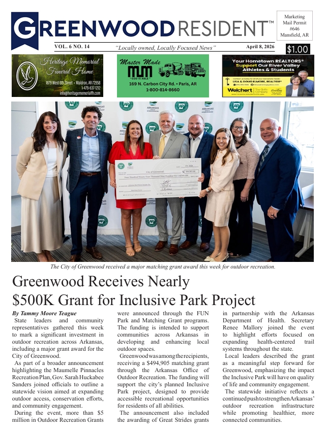 Greenwood Resident 04/8/26 Vol. 6 No. 14 Insider 5:19 pm Updated: 3 hours ago By Resident News Network Share FacebookTwitterLinkedinPinterestWhatsAppEmail This content is reserved for RESIDENT INSIDER members. Please login or subscribe to view. - Paid Advertisement - Resident News Networkhttps://residentnewsnetwork.comLocally owned, locally focused news + sports source for the Arkansas River Valley. Share FacebookTwitterLinkedinPinterestWhatsAppEmail Latest news Insider Resident Press (Scott & So. Sebastian County edition) 4/8/26 Vol. 8 No. 14 Resident News Network - 5:16 pm - Paid Advertisement - - Affiliate - Insider Resident Press (Lavaca, Charleston, Paris edition) 4/8/26 Vol. 5 No. 14 Resident News Network - 5:13 pm Obituaries Obituary: Wesley Wagner (1946-2026) Resident News Network - 3:14 pm Featured Mansfield Elementary Student Dominates Multi-Division Chess Tournament Resident News Network - 2:56 pm Related news Insider Resident Press (Scott & So. Sebastian County edition) 4/8/26 Vol. 8 No. 14 Resident News Network - 5:16 pm Insider Resident Press (Lavaca, Charleston, Paris edition) 4/8/26 Vol. 5 No. 14 Resident News Network - 5:13 pm Obituaries Obituary: Wesley Wagner (1946-2026) Resident News Network - 3:14 pm Featured Mansfield Elementary Student Dominates Multi-Division Chess Tournament Resident News Network - 2:56 pm - Paid Advertisement -