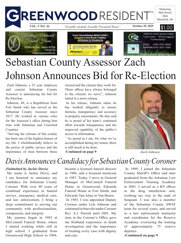 Greenwood Resident 10/29/25 Vol. 5 No. 44 Insider 8:35 am Updated: By Resident News Network Share FacebookTwitterLinkedinPinterestWhatsAppEmail This content is reserved for RESIDENT INSIDER members. Please login or subscribe to view. - Paid Advertisement - TagsGreenwood Resident News Networkhttps://residentnewsnetwork.comLocally owned, locally focused news + sports source for the Arkansas River Valley. Share FacebookTwitterLinkedinPinterestWhatsAppEmail Latest news News State Capitol Week in Review from Senator Terry Rice Resident News Network - 2:08 pm - Paid Advertisement - - Affiliate - Food “Just Roll with It” Serving up Recipes and Humor Resident News Network - 2:06 pm Lifestyle Greenwood Fine Arts Academy Launches Fundraiser in Hopes of Building Permanent Community Arts Center Resident News Network - 2:02 pm Networks Candidate Forum Draws Strong Crowd for In-Depth Discussion Ahead of Elections Resident News Network - 11:43 pm Related news News State Capitol Week in Review from Senator Terry Rice Resident News Network - 2:08 pm Food “Just Roll with It” Serving up Recipes and Humor Resident News Network - 2:06 pm Lifestyle Greenwood Fine Arts Academy Launches Fundraiser in Hopes of Building Permanent Community Arts Center Resident News Network - 2:02 pm Networks Candidate Forum Draws Strong Crowd for In-Depth Discussion Ahead of Elections Resident News Network - 11:43 pm - Paid Advertisement -