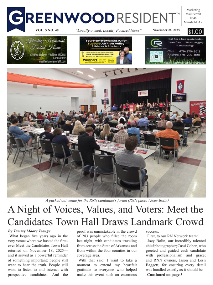 Greenwood Resident 11/26/25 Vol. 5 No. 48 Insider 3:11 pm Updated: By Resident News Network Share FacebookTwitterLinkedinPinterestWhatsAppEmail This content is reserved for RESIDENT INSIDER members. Please login or subscribe to view. - Paid Advertisement - Resident News Networkhttps://residentnewsnetwork.comLocally owned, locally focused news + sports source for the Arkansas River Valley. Share FacebookTwitterLinkedinPinterestWhatsAppEmail Latest news Featured Oregon-California Trail Association visit area to film historical documentaries Resident News Network - 9:00 pm - Paid Advertisement - - Affiliate - Headlines Honoring a Legacy of Service: David Millard Recognized for 25 Years with the Waldron Fire Department Cassie Coben - 6:43 pm Insider ‘A Flag’s Journey, A Nation’s Promise’: Stars and Stripes Sojourn 250 Inspires at Fort Smith National Cemetery Resident News Network - 12:27 pm Insider Greenwood Athletics News and Notes Ross Fujibayashi - 12:14 am Related news Featured Oregon-California Trail Association visit area to film historical documentaries Resident News Network - 9:00 pm Headlines Honoring a Legacy of Service: David Millard Recognized for 25 Years with the Waldron Fire Department Cassie Coben - 6:43 pm Insider ‘A Flag’s Journey, A Nation’s Promise’: Stars and Stripes Sojourn 250 Inspires at Fort Smith National Cemetery Resident News Network - 12:27 pm Insider Greenwood Athletics News and Notes Ross Fujibayashi - 12:14 am - Paid Advertisement -