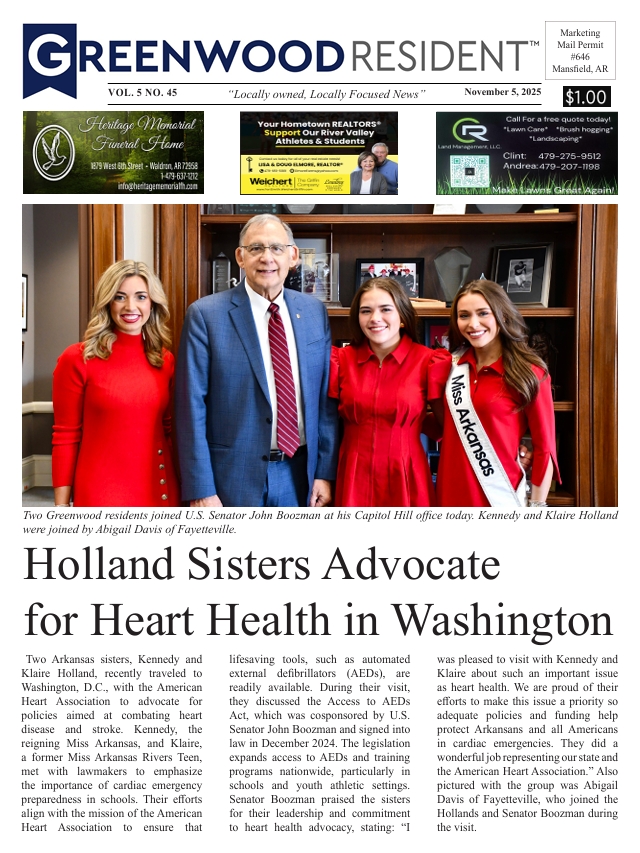 Greenwood Resident 11/5/25 Vol. 5 No. 45 Insider 3:10 pm Updated: By Resident News Network Share FacebookTwitterLinkedinPinterestWhatsAppEmail This content is reserved for RESIDENT INSIDER members. Please login or subscribe to view. - Paid Advertisement - Resident News Networkhttps://residentnewsnetwork.comLocally owned, locally focused news + sports source for the Arkansas River Valley. Share FacebookTwitterLinkedinPinterestWhatsAppEmail Latest news Featured Oregon-California Trail Association visit area to film historical documentaries Resident News Network - 9:00 pm - Paid Advertisement - - Affiliate - Headlines Honoring a Legacy of Service: David Millard Recognized for 25 Years with the Waldron Fire Department Cassie Coben - 6:43 pm Insider ‘A Flag’s Journey, A Nation’s Promise’: Stars and Stripes Sojourn 250 Inspires at Fort Smith National Cemetery Resident News Network - 12:27 pm Insider Greenwood Athletics News and Notes Ross Fujibayashi - 12:14 am Related news Featured Oregon-California Trail Association visit area to film historical documentaries Resident News Network - 9:00 pm Headlines Honoring a Legacy of Service: David Millard Recognized for 25 Years with the Waldron Fire Department Cassie Coben - 6:43 pm Insider ‘A Flag’s Journey, A Nation’s Promise’: Stars and Stripes Sojourn 250 Inspires at Fort Smith National Cemetery Resident News Network - 12:27 pm Insider Greenwood Athletics News and Notes Ross Fujibayashi - 12:14 am - Paid Advertisement -
