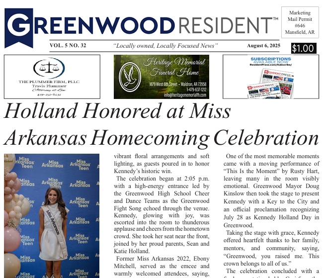 Greenwood Resident 8/6/25 Vol. 5 No. 32 Insider 11:21 am Updated: By Resident News Network Share FacebookTwitterLinkedinPinterestWhatsAppEmail This content is reserved for RESIDENT INSIDER members. Please login or subscribe to view. - Paid Advertisement - Tagse-editionGreenwoodInsider Resident News Networkhttps://residentnewsnetwork.comLocally owned, locally focused news + sports source for the Arkansas River Valley. Share FacebookTwitterLinkedinPinterestWhatsAppEmail Latest news Featured Oregon-California Trail Association visit area to film historical documentaries Resident News Network - 9:00 pm - Paid Advertisement - - Affiliate - Headlines Honoring a Legacy of Service: David Millard Recognized for 25 Years with the Waldron Fire Department Cassie Coben - 6:43 pm Insider ‘A Flag’s Journey, A Nation’s Promise’: Stars and Stripes Sojourn 250 Inspires at Fort Smith National Cemetery Resident News Network - 12:27 pm Insider Greenwood Athletics News and Notes Ross Fujibayashi - 12:14 am Related news Featured Oregon-California Trail Association visit area to film historical documentaries Resident News Network - 9:00 pm Headlines Honoring a Legacy of Service: David Millard Recognized for 25 Years with the Waldron Fire Department Cassie Coben - 6:43 pm Insider ‘A Flag’s Journey, A Nation’s Promise’: Stars and Stripes Sojourn 250 Inspires at Fort Smith National Cemetery Resident News Network - 12:27 pm Insider Greenwood Athletics News and Notes Ross Fujibayashi - 12:14 am - Paid Advertisement -