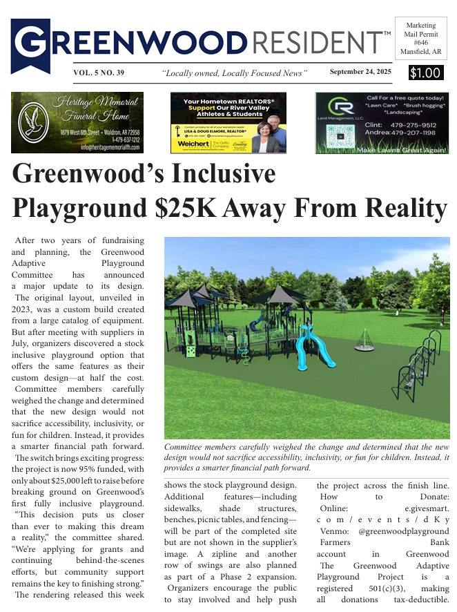 Greenwood Resident 9/24/25 Vol. 5 No. 39 Insider 8:58 am Updated: By Resident News Network Share FacebookTwitterLinkedinPinterestWhatsAppEmail This content is reserved for RESIDENT INSIDER members. Please login or subscribe to view. - Paid Advertisement - TagsGreenwood Resident News Networkhttps://residentnewsnetwork.comLocally owned, locally focused news + sports source for the Arkansas River Valley. Share FacebookTwitterLinkedinPinterestWhatsAppEmail Latest news Featured Oregon-California Trail Association visit area to film historical documentaries Resident News Network - 9:00 pm - Paid Advertisement - - Affiliate - Headlines Honoring a Legacy of Service: David Millard Recognized for 25 Years with the Waldron Fire Department Cassie Coben - 6:43 pm Insider ‘A Flag’s Journey, A Nation’s Promise’: Stars and Stripes Sojourn 250 Inspires at Fort Smith National Cemetery Resident News Network - 12:27 pm Insider Greenwood Athletics News and Notes Ross Fujibayashi - 12:14 am Related news Featured Oregon-California Trail Association visit area to film historical documentaries Resident News Network - 9:00 pm Headlines Honoring a Legacy of Service: David Millard Recognized for 25 Years with the Waldron Fire Department Cassie Coben - 6:43 pm Insider ‘A Flag’s Journey, A Nation’s Promise’: Stars and Stripes Sojourn 250 Inspires at Fort Smith National Cemetery Resident News Network - 12:27 pm Insider Greenwood Athletics News and Notes Ross Fujibayashi - 12:14 am - Paid Advertisement -