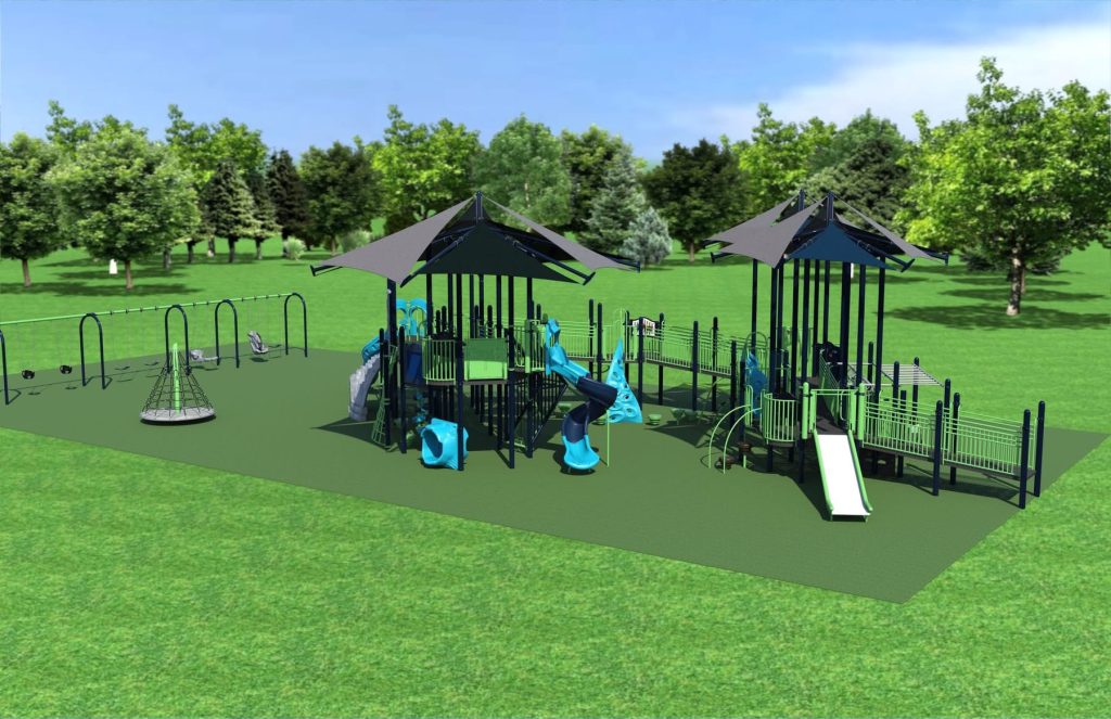 The rendering released this week shows the stock playground design. Additional features—including sidewalks, shade structures, benches, picnic tables, and fencing—will be part of the completed site but are not shown in the supplier’s image. A zipline and another row of swings are also planned as part of a Phase 2 expansion.