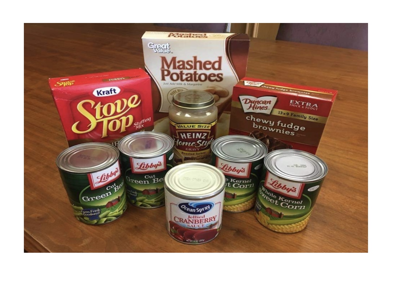 Donations of Instant Mashed Potatoes, Stuffing, canned Corn and Green Beans, Cranberry Sauce, Gravy Mix, and Brownie Mix are being collected to round out the holiday feast.