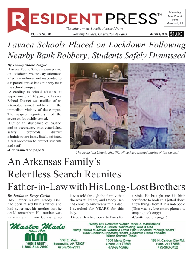 Resident Press (Lavaca, Charleston, Paris edition) 03/04/26 Vol. 5 No. 9 Insider 4:21 pm Updated: 2 hours ago By Resident News Network Share FacebookTwitterLinkedinPinterestWhatsAppEmail This content is reserved for RESIDENT INSIDER members. Please login or subscribe to view. - Paid Advertisement - Resident News Networkhttps://residentnewsnetwork.comLocally owned, locally focused news + sports source for the Arkansas River Valley. Share FacebookTwitterLinkedinPinterestWhatsAppEmail Latest news Insider Resident Press (Scott & So. Sebastian County edition) 03/04/26 Vol. 8 No. 098 Resident News Network - 4:14 pm - Paid Advertisement - - Affiliate - Insider Greenwood Resident 03/4/26 Vol. 6 No. 09 Resident News Network - 4:10 pm Featured Donor Champions Take the Court: Score a Basketball T-shirt When You Donate Blood Resident News Network - 4:02 pm Outdoors AGFC proposes simplified deer season structure and reduced regulations for 2026Â Resident News Network - 4:01 pm Related news Insider Resident Press (Scott & So. Sebastian County edition) 03/04/26 Vol. 8 No. 098 Resident News Network - 4:14 pm Insider Greenwood Resident 03/4/26 Vol. 6 No. 09 Resident News Network - 4:10 pm Featured Donor Champions Take the Court: Score a Basketball T-shirt When You Donate Blood Resident News Network - 4:02 pm Outdoors AGFC proposes simplified deer season structure and reduced regulations for 2026Â Resident News Network - 4:01 pm - Paid Advertisement -