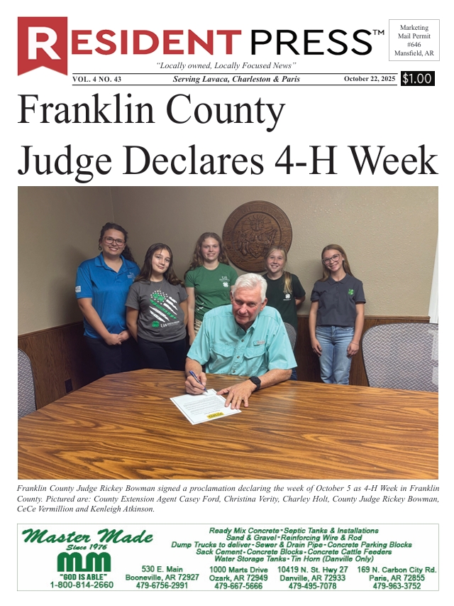 Resident Press (Lavaca, Charleston, Paris edition) 10/22/25 Vol. 4 No. 43 Insider 4:22 pm Updated: By Resident News Network Share FacebookTwitterLinkedinPinterestWhatsAppEmail This content is reserved for RESIDENT INSIDER members. Please login or subscribe to view. - Paid Advertisement - TagsfranklinLogan Resident News Networkhttps://residentnewsnetwork.comLocally owned, locally focused news + sports source for the Arkansas River Valley. Share FacebookTwitterLinkedinPinterestWhatsAppEmail Latest news Featured Oregon-California Trail Association visit area to film historical documentaries Resident News Network - 9:00 pm - Paid Advertisement - - Affiliate - Headlines Honoring a Legacy of Service: David Millard Recognized for 25 Years with the Waldron Fire Department Cassie Coben - 6:43 pm Insider ‘A Flag’s Journey, A Nation’s Promise’: Stars and Stripes Sojourn 250 Inspires at Fort Smith National Cemetery Resident News Network - 12:27 pm Insider Greenwood Athletics News and Notes Ross Fujibayashi - 12:14 am Related news Featured Oregon-California Trail Association visit area to film historical documentaries Resident News Network - 9:00 pm Headlines Honoring a Legacy of Service: David Millard Recognized for 25 Years with the Waldron Fire Department Cassie Coben - 6:43 pm Insider ‘A Flag’s Journey, A Nation’s Promise’: Stars and Stripes Sojourn 250 Inspires at Fort Smith National Cemetery Resident News Network - 12:27 pm Insider Greenwood Athletics News and Notes Ross Fujibayashi - 12:14 am - Paid Advertisement -