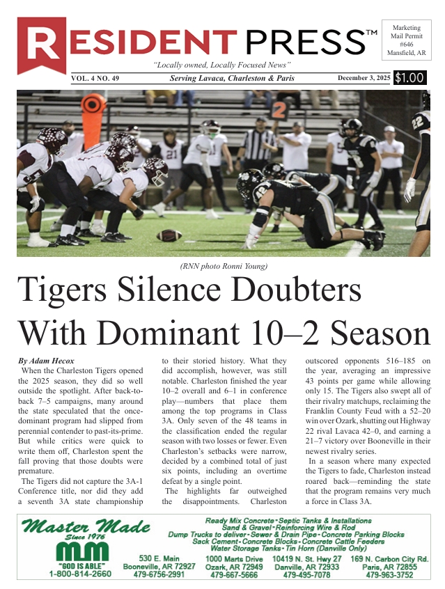 Resident Press (Lavaca, Charleston, Paris edition) 12/3/25 Vol. 4 No. 49 Insider 3:39 pm Updated: 6 days ago By Resident News Network Share FacebookTwitterLinkedinPinterestWhatsAppEmail This content is reserved for RESIDENT INSIDER members. Please login or subscribe to view. - Paid Advertisement - Resident News Networkhttps://residentnewsnetwork.comLocally owned, locally focused news + sports source for the Arkansas River Valley. Share FacebookTwitterLinkedinPinterestWhatsAppEmail Latest news Featured Oregon-California Trail Association visit area to film historical documentaries Resident News Network - 9:00 pm - Paid Advertisement - - Affiliate - Headlines Honoring a Legacy of Service: David Millard Recognized for 25 Years with the Waldron Fire Department Cassie Coben - 6:43 pm Insider ‘A Flag’s Journey, A Nation’s Promise’: Stars and Stripes Sojourn 250 Inspires at Fort Smith National Cemetery Resident News Network - 12:27 pm Insider Greenwood Athletics News and Notes Ross Fujibayashi - 12:14 am Related news Featured Oregon-California Trail Association visit area to film historical documentaries Resident News Network - 9:00 pm Headlines Honoring a Legacy of Service: David Millard Recognized for 25 Years with the Waldron Fire Department Cassie Coben - 6:43 pm Insider ‘A Flag’s Journey, A Nation’s Promise’: Stars and Stripes Sojourn 250 Inspires at Fort Smith National Cemetery Resident News Network - 12:27 pm Insider Greenwood Athletics News and Notes Ross Fujibayashi - 12:14 am - Paid Advertisement -