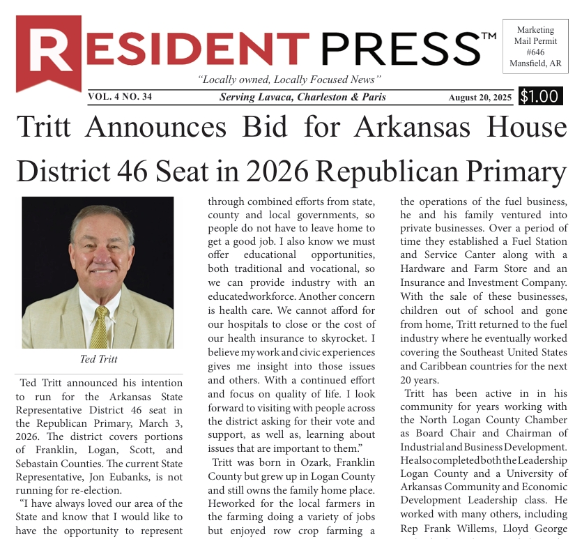 Resident Press (Lavaca, Charleston, Paris edition) 8/20/25 Vol. 4 No. 34 Insider 9:27 pm Updated: By Resident News Network Share FacebookTwitterLinkedinPinterestWhatsAppEmail This content is reserved for RESIDENT INSIDER members. Please login or subscribe to view. - Paid Advertisement - TagsfranklinInsiderLogan Resident News Networkhttps://residentnewsnetwork.comLocally owned, locally focused news + sports source for the Arkansas River Valley. Share FacebookTwitterLinkedinPinterestWhatsAppEmail Latest news Featured Oregon-California Trail Association visit area to film historical documentaries Resident News Network - 9:00 pm - Paid Advertisement - - Affiliate - Headlines Honoring a Legacy of Service: David Millard Recognized for 25 Years with the Waldron Fire Department Cassie Coben - 6:43 pm Insider ‘A Flag’s Journey, A Nation’s Promise’: Stars and Stripes Sojourn 250 Inspires at Fort Smith National Cemetery Resident News Network - 12:27 pm Insider Greenwood Athletics News and Notes Ross Fujibayashi - 12:14 am Related news Featured Oregon-California Trail Association visit area to film historical documentaries Resident News Network - 9:00 pm Headlines Honoring a Legacy of Service: David Millard Recognized for 25 Years with the Waldron Fire Department Cassie Coben - 6:43 pm Insider ‘A Flag’s Journey, A Nation’s Promise’: Stars and Stripes Sojourn 250 Inspires at Fort Smith National Cemetery Resident News Network - 12:27 pm Insider Greenwood Athletics News and Notes Ross Fujibayashi - 12:14 am - Paid Advertisement -