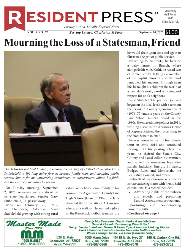 Resident Press (Lavaca, Charleston, Paris edition) 9/10/25 Vol. 4 No. 37 Insider 6:02 pm Updated: By Resident News Network Share FacebookTwitterLinkedinPinterestWhatsAppEmail This content is reserved for RESIDENT INSIDER members. Please login or subscribe to view. - Paid Advertisement - TagsCharlestonlavacaMagazineParis Resident News Networkhttps://residentnewsnetwork.comLocally owned, locally focused news + sports source for the Arkansas River Valley. Share FacebookTwitterLinkedinPinterestWhatsAppEmail Latest news Featured Oregon-California Trail Association visit area to film historical documentaries Resident News Network - 9:00 pm - Paid Advertisement - - Affiliate - Headlines Honoring a Legacy of Service: David Millard Recognized for 25 Years with the Waldron Fire Department Cassie Coben - 6:43 pm Insider ‘A Flag’s Journey, A Nation’s Promise’: Stars and Stripes Sojourn 250 Inspires at Fort Smith National Cemetery Resident News Network - 12:27 pm Insider Greenwood Athletics News and Notes Ross Fujibayashi - 12:14 am Related news Featured Oregon-California Trail Association visit area to film historical documentaries Resident News Network - 9:00 pm Headlines Honoring a Legacy of Service: David Millard Recognized for 25 Years with the Waldron Fire Department Cassie Coben - 6:43 pm Insider ‘A Flag’s Journey, A Nation’s Promise’: Stars and Stripes Sojourn 250 Inspires at Fort Smith National Cemetery Resident News Network - 12:27 pm Insider Greenwood Athletics News and Notes Ross Fujibayashi - 12:14 am - Paid Advertisement -