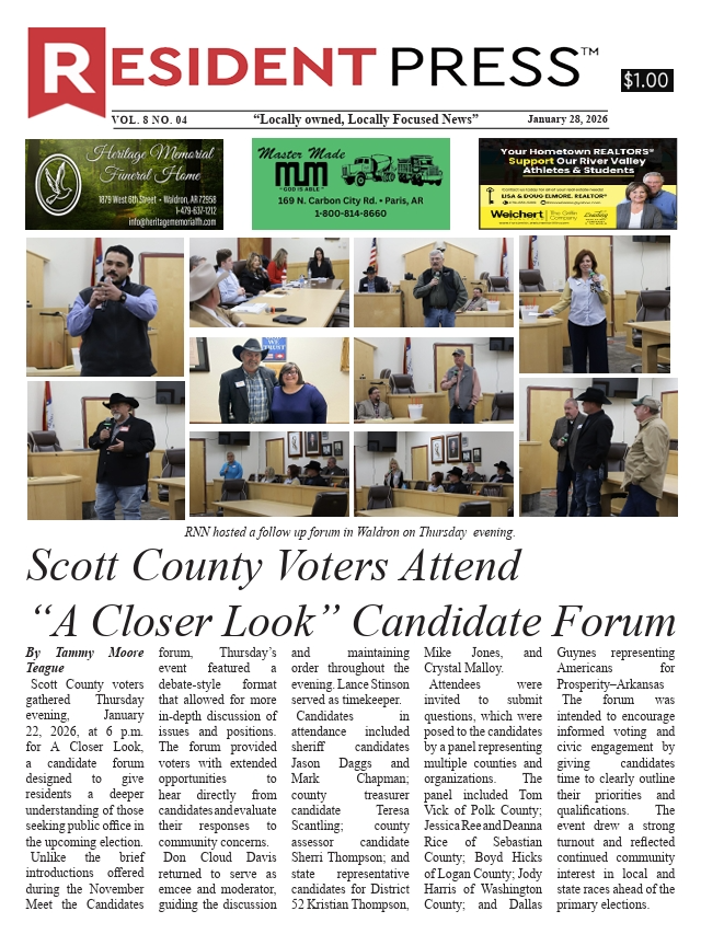 Resident Press (Scott & So. Sebastian County edition) 01/28/26 Vol. 8 No. 04 Insider 4:03 pm Updated: 3 hours ago By Resident News Network Share FacebookTwitterLinkedinPinterestWhatsAppEmail This content is reserved for RESIDENT INSIDER members. Please login or subscribe to view. - Paid Advertisement - Resident News Networkhttps://residentnewsnetwork.comLocally owned, locally focused news + sports source for the Arkansas River Valley. Share FacebookTwitterLinkedinPinterestWhatsAppEmail Latest news Obituaries Obituary: Harold Thomas (1936-2026) Resident News Network - 4:15 pm - Paid Advertisement - - Affiliate - Featured Timepiece: Giveaways and Promotions Resident News Network - 4:05 pm Insider Greenwood Resident 01/28/26 Vol. 6 No. 04 Resident News Network - 4:01 pm Insider Resident Press (Lavaca, Charleston, Paris edition) 01/28/26 Vol. 5 No. 4 Resident News Network - 3:58 pm Related news Obituaries Obituary: Harold Thomas (1936-2026) Resident News Network - 4:15 pm Featured Timepiece: Giveaways and Promotions Resident News Network - 4:05 pm Insider Greenwood Resident 01/28/26 Vol. 6 No. 04 Resident News Network - 4:01 pm Insider Resident Press (Lavaca, Charleston, Paris edition) 01/28/26 Vol. 5 No. 4 Resident News Network - 3:58 pm - Paid Advertisement -