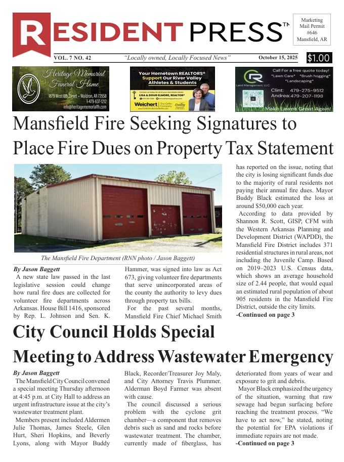 Resident Press (Scott & So. Sebastian County edition) 10/15/25 Vol. 7 No. 42 Insider 1:30 pm Updated: By Resident News Network Share FacebookTwitterLinkedinPinterestWhatsAppEmail This content is reserved for RESIDENT INSIDER members. Please login or subscribe to view. - Paid Advertisement - TagsScottSebastian Resident News Networkhttps://residentnewsnetwork.comLocally owned, locally focused news + sports source for the Arkansas River Valley. Share FacebookTwitterLinkedinPinterestWhatsAppEmail Latest news Featured Oregon-California Trail Association visit area to film historical documentaries Resident News Network - 9:00 pm - Paid Advertisement - - Affiliate - Headlines Honoring a Legacy of Service: David Millard Recognized for 25 Years with the Waldron Fire Department Cassie Coben - 6:43 pm Insider ‘A Flag’s Journey, A Nation’s Promise’: Stars and Stripes Sojourn 250 Inspires at Fort Smith National Cemetery Resident News Network - 12:27 pm Insider Greenwood Athletics News and Notes Ross Fujibayashi - 12:14 am Related news Featured Oregon-California Trail Association visit area to film historical documentaries Resident News Network - 9:00 pm Headlines Honoring a Legacy of Service: David Millard Recognized for 25 Years with the Waldron Fire Department Cassie Coben - 6:43 pm Insider ‘A Flag’s Journey, A Nation’s Promise’: Stars and Stripes Sojourn 250 Inspires at Fort Smith National Cemetery Resident News Network - 12:27 pm Insider Greenwood Athletics News and Notes Ross Fujibayashi - 12:14 am - Paid Advertisement -