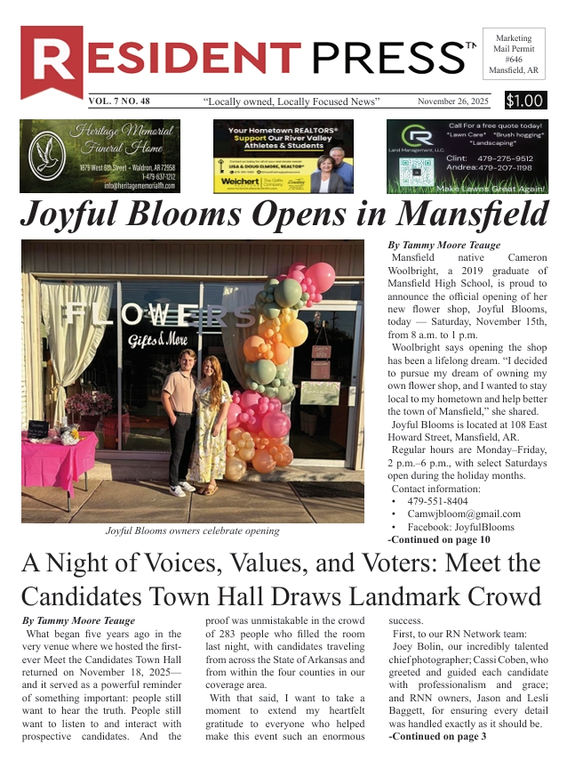 Resident Press (Scott & So. Sebastian County edition) 11/26/25 Vol. 7 No. 48 Insider 3:08 pm Updated: By Resident News Network Share FacebookTwitterLinkedinPinterestWhatsAppEmail This content is reserved for RESIDENT INSIDER members. Please login or subscribe to view. - Paid Advertisement - Resident News Networkhttps://residentnewsnetwork.comLocally owned, locally focused news + sports source for the Arkansas River Valley. Share FacebookTwitterLinkedinPinterestWhatsAppEmail Latest news Featured Oregon-California Trail Association visit area to film historical documentaries Resident News Network - 9:00 pm - Paid Advertisement - - Affiliate - Headlines Honoring a Legacy of Service: David Millard Recognized for 25 Years with the Waldron Fire Department Cassie Coben - 6:43 pm Insider ‘A Flag’s Journey, A Nation’s Promise’: Stars and Stripes Sojourn 250 Inspires at Fort Smith National Cemetery Resident News Network - 12:27 pm Insider Greenwood Athletics News and Notes Ross Fujibayashi - 12:14 am Related news Featured Oregon-California Trail Association visit area to film historical documentaries Resident News Network - 9:00 pm Headlines Honoring a Legacy of Service: David Millard Recognized for 25 Years with the Waldron Fire Department Cassie Coben - 6:43 pm Insider ‘A Flag’s Journey, A Nation’s Promise’: Stars and Stripes Sojourn 250 Inspires at Fort Smith National Cemetery Resident News Network - 12:27 pm Insider Greenwood Athletics News and Notes Ross Fujibayashi - 12:14 am - Paid Advertisement -