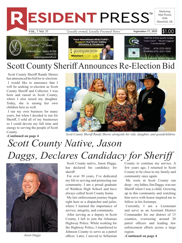 Resident Press (Scott & So. Sebastian County edition) 9/17/25 Vol. 7 No. 37 Insider 6:26 am Updated: By Resident News Network Share FacebookTwitterLinkedinPinterestWhatsAppEmail This content is reserved for RESIDENT INSIDER members. Please login or subscribe to view. - Paid Advertisement - TagsHackettMansfieldWaldron Resident News Networkhttps://residentnewsnetwork.comLocally owned, locally focused news + sports source for the Arkansas River Valley. Share FacebookTwitterLinkedinPinterestWhatsAppEmail Latest news Featured Oregon-California Trail Association visit area to film historical documentaries Resident News Network - 9:00 pm - Paid Advertisement - - Affiliate - Headlines Honoring a Legacy of Service: David Millard Recognized for 25 Years with the Waldron Fire Department Cassie Coben - 6:43 pm Insider ‘A Flag’s Journey, A Nation’s Promise’: Stars and Stripes Sojourn 250 Inspires at Fort Smith National Cemetery Resident News Network - 12:27 pm Insider Greenwood Athletics News and Notes Ross Fujibayashi - 12:14 am Related news Featured Oregon-California Trail Association visit area to film historical documentaries Resident News Network - 9:00 pm Headlines Honoring a Legacy of Service: David Millard Recognized for 25 Years with the Waldron Fire Department Cassie Coben - 6:43 pm Insider ‘A Flag’s Journey, A Nation’s Promise’: Stars and Stripes Sojourn 250 Inspires at Fort Smith National Cemetery Resident News Network - 12:27 pm Insider Greenwood Athletics News and Notes Ross Fujibayashi - 12:14 am - Paid Advertisement -