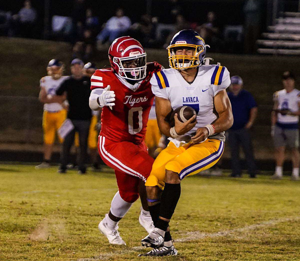 The Tigers started the game by kicking the ball off to Lavaca and shipped out their defense to get a jump start on the Golden Arrows’ potent offense. Lavaca averaged 22.8 points per game against some stiff competition leading up to the matchup so the question was, could Mansfield keep the Golden Arrows air raid offense grounded? It didn’t look very promising at first as the Tigers allowed a four-yard run on the opening play then followed that up with a defensive offsides penalty to give Lavaca a third and short opportunity. The Golden Arrows then zipped a pass downfield for a 25-yard completion, but Andrew Burton and Samuel Burton laid down the boom on the Lavaca receiver forcing a fumble that was quickly recovered by Zander Walters. With the Tigers now in possession of the football, Mansfield was ready to roll with their ground-and-pound offense to wear down Lavaca. The Tigers started with a four-yard run up the gut by Andrew Burton, but on the next play from scrimmage, Trey Powell traded in the ground and pound tactic for a need, a need for speed that is. Powell took the pitch from quarterback Jeremey Strozier and screamed downfield for a 63-yard Tiger touchdown. Samuel Burton tacked on the two-point conversion giving Mansfield a fast 8-0 over Lavaca. Lavaca was able to put together an eight-play 46-yard drive on their next possession but stalled out turning the ball over on downs. The Tigers offense didn’t slow down any on the ensuing drive as Jeremy Strozier read the defense perfectly and kept the ball for a 40-yard run which helped set up a pass from Strozier to Samuel Burton for a 12-yard Tiger touchdown. Andrew Burton powered into the endzone for the two-point conversion to push the score up to a 16-0 Mansfield lead.