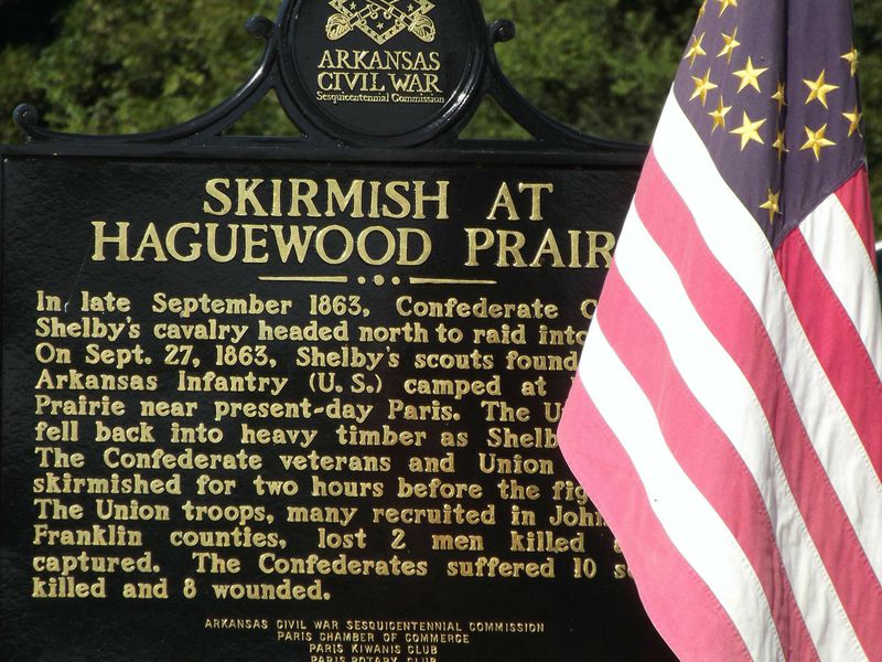 Right at noon, Thorpe topped a small hill near Haguewood Creek, just east of present day Paris, Arkansas and surprised eighty or more Union troops encamped along the creek. The 1st Arkansas Infantry, under Captain William Parker, had picked up ammunition and weapons at Dardanelle and were resupplying local guerilla supporters. Many of Parker’s men were from the local area and were happily visiting family while resupplying friends with weapons. Grabbing up weapons, one of the largest skirmishes of the river valley ensued. Bullets flew from both sides; many of Shelby’s men were equipped with repeater pistols and multiple guns. Even with the traditional weapons, a civil war soldier could load and fire three to five times in a minute. Shelby, hearing the fire of his advance troops, hurried his men in support. Union Soldiers ducked behind trees and wagons and the battle raged. Benjamin Wilks, a union soldier from the area, fell, pierced by a rain of bullets from the confederates. William Hawkins was in one of the wagons, accompanied by his sister who was visiting. Firing out the back of the wagon, he fought bravely until falling at her feet.