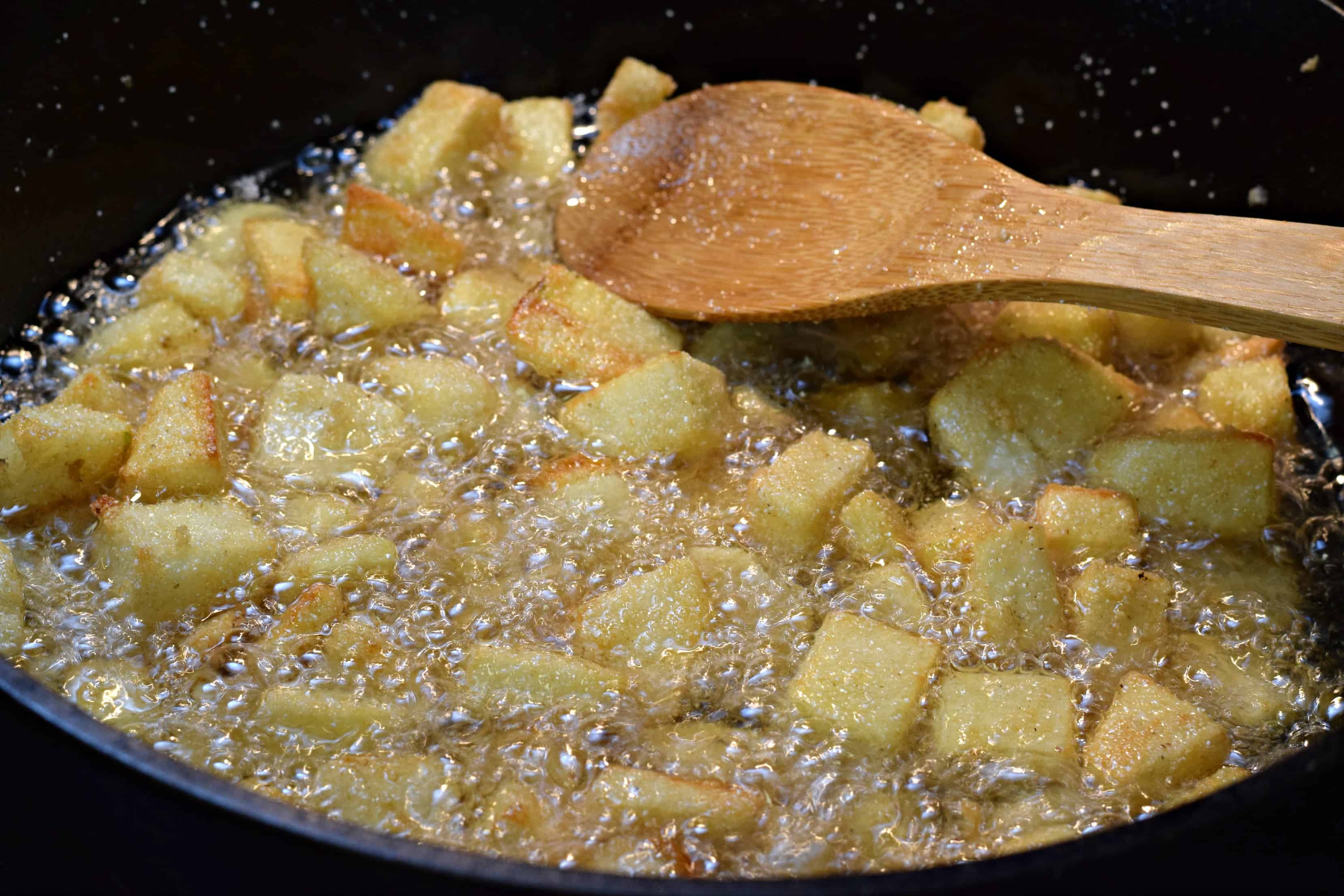 Fill a deep skillet with cooking oil (I’m using vegetable oil) to a depth of about 1/2 an inch. Let this heat up over medium high heat until oil is hot enough to fry in. To test this, I just sprinkle a wee bit of corn meal over the oil and if it bubbles then I know the oil is hot enough. Before adding potatoes, reduce heat to medium. Add potatoes to hot oil and cook, stirring often, until potatoes are lightly browned and tender.