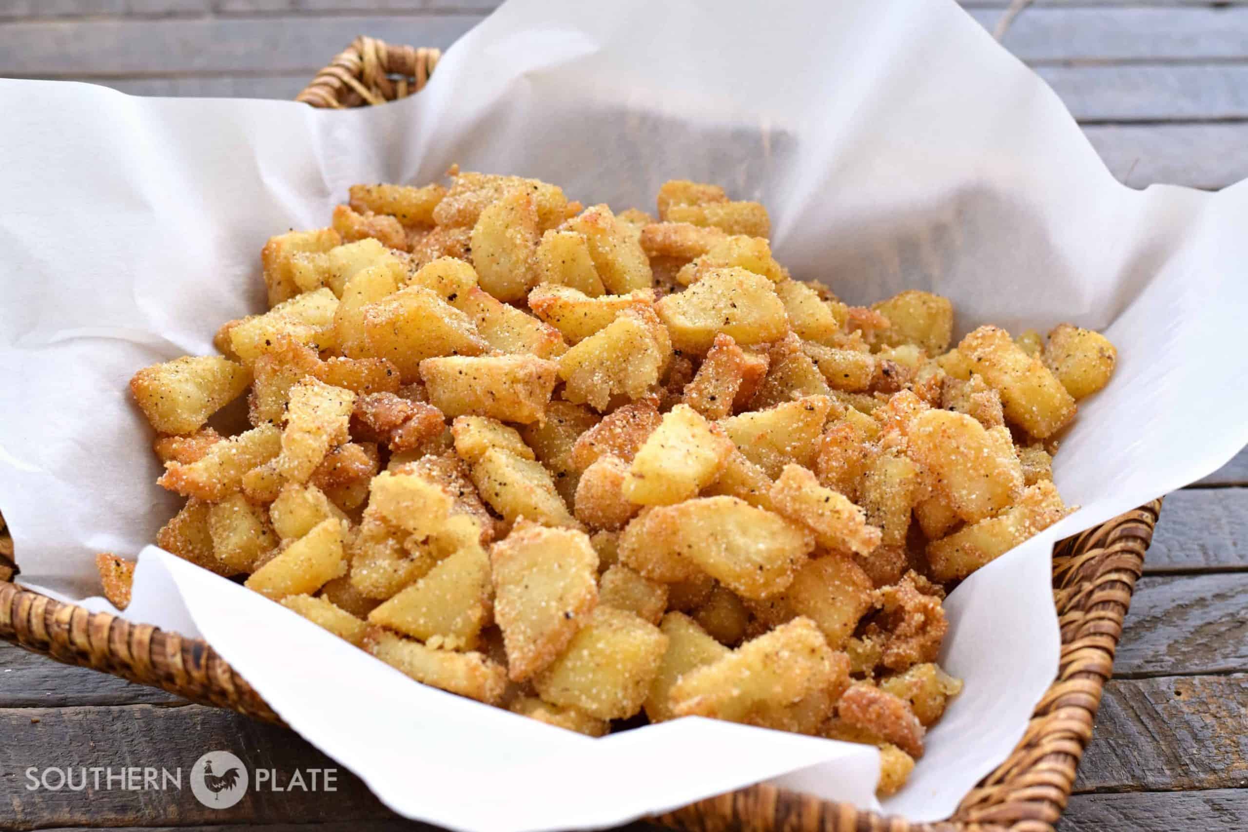The only things you need are some ‘taters, corn meal mix, and seasoned salt…