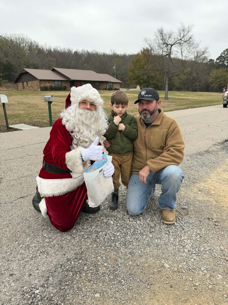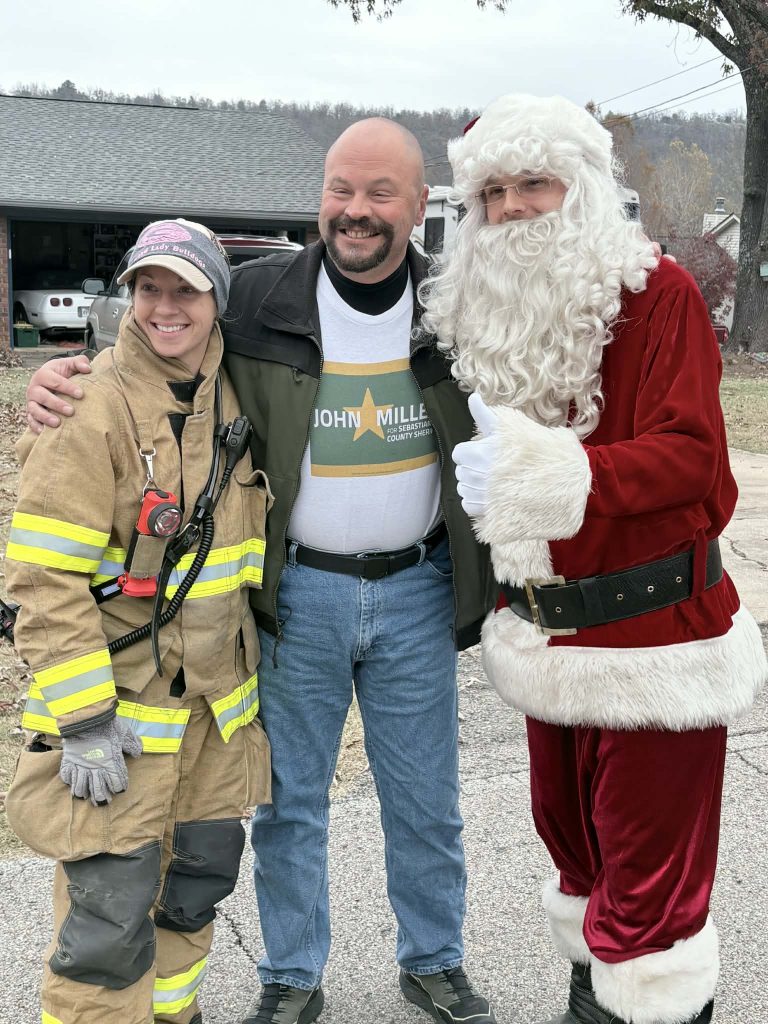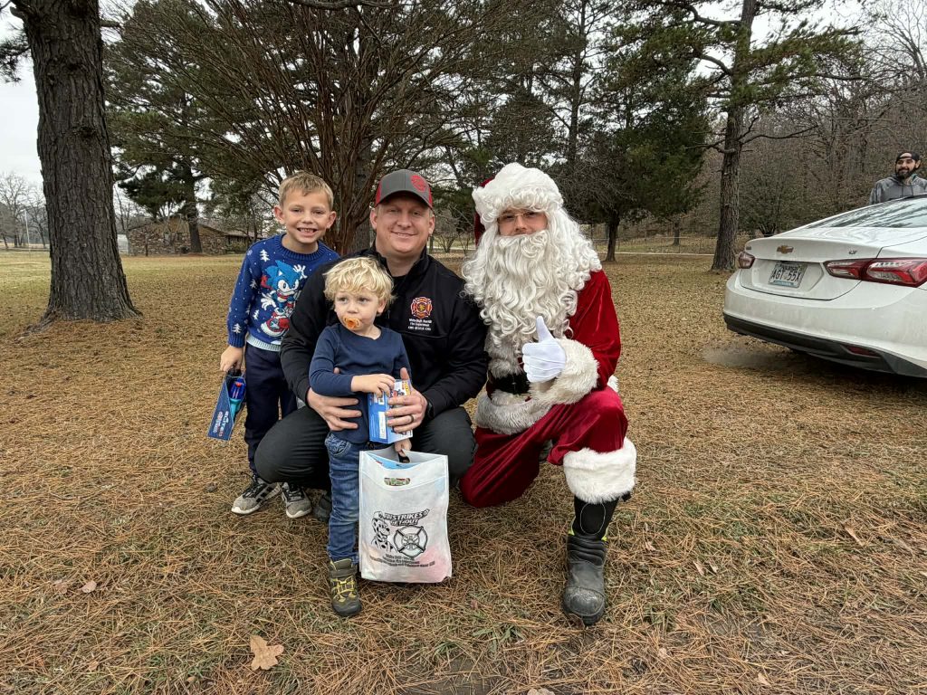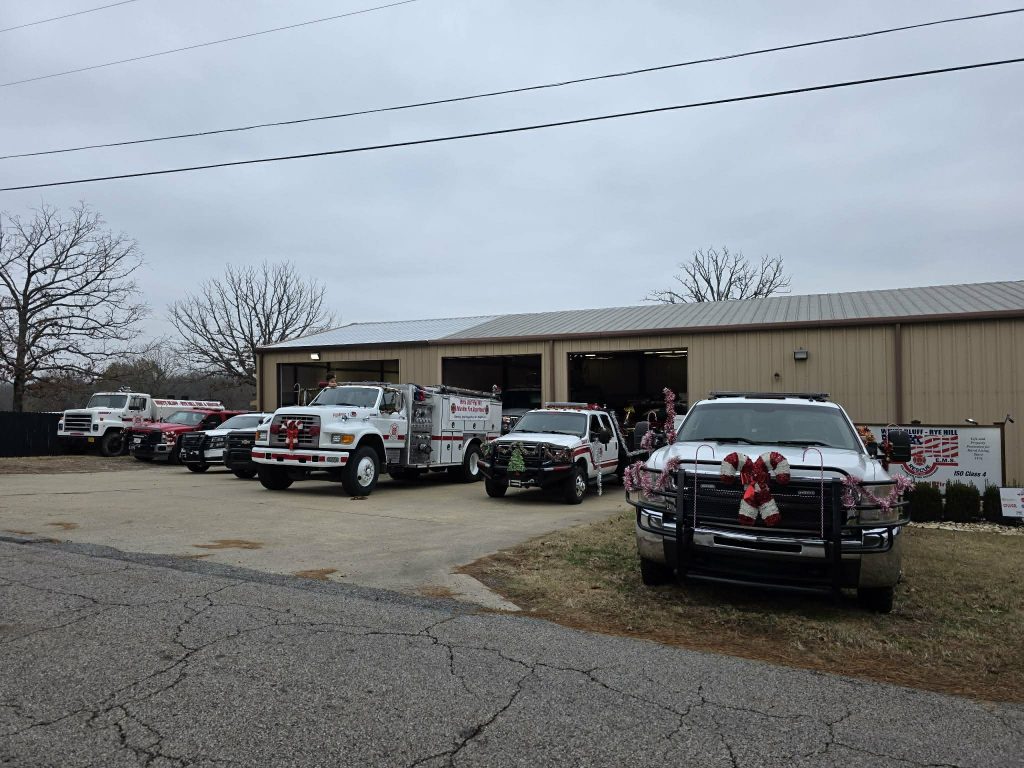 By early afternoon on Sunday, three fully staffed pumpers rolled out, each assigned to one of the mapped routes that ensure Santa visits every corner of the White Bluff–Rye Hill fire district. Riding proudly on the tailboard was Santa himself, surrounded by a cheerful crew of elves. Behind them followed a support convoy including Sebastian County Emergency Management and law enforcement, lending not only manpower but festivity — complete with sirens and lights dancing against the gray sky.